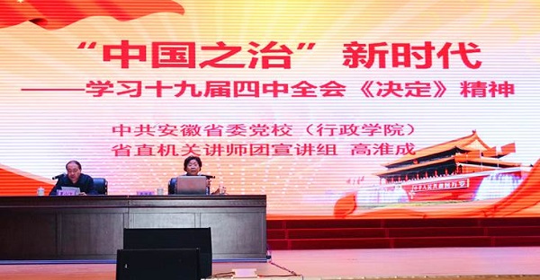 12月11日下午,省委老干部局在安徽老年大学(省老干部活动中心)报告厅举行学习贯彻党的十九届四中全会精神辅导报告会。省直机关宣讲团成员、省委党校教授高淮成应邀作辅导报告。省委组织部副部长、老干部局局长夏小飞主持报告会,省委老干部局副局长孙来友,安徽老年大学(省老干部活动中心)教务长聂晓华,省委老干部局干部职工、离退休老同志,安徽老年大学(省老干部活动中心)师生员工出席报告会。