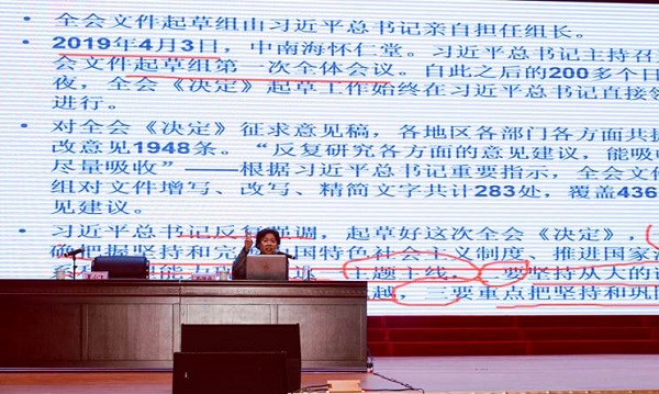 “怎样深刻认识坚持和完善中国特色社会主义制度、推进国家治理体系和治理能力现代化的重大意义”“怎样深刻理解中国特色社会主义制度和国家治理体系的十三个显著优势”“怎样准确把握《决定》总论部分提出的总体要求、总体目标”“怎样准确把握《决定》分论部分提出的十三个坚持和完善”“怎样把四中全会精神真正落到实处”……在辅导报告中,高淮成教授对四中全会精神进行了全面系统、深入浅出的解读和阐释。