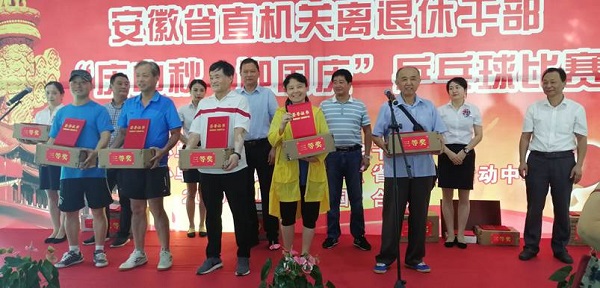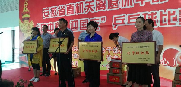 比赛于20日下午圆满落幕,最终中国科学技术大学、省教育厅、合肥工业大学、安徽广播电视台、省税务局、省人社厅、合肥学院7支代表队荣获团体前七名;省委办公厅代表队、安徽中医药大学代表队、省林业局代表队荣获优秀组织奖;省卫健委代表队、省生态环境厅代表队荣获道德风尚奖。荣获男子单打前八名的是:中国科学技术大学的李争鸣、省委党校的乔爱书、省纪委的张东安、省教育厅的江传瑞、安徽广播电视台的曾润秋、省教育厅的金智、省卫健委的陈良然、省委办公厅的吴训智;荣获女子单打前八名的是:人民银行合肥支行的张萍、合肥工业大学的费明、省质监局的吉南平、省卫健委的夏爱平、省生态环境厅的孙力、省卫健委的姚定红、省生态环境厅的宛永红、省生态环境厅的陈小坤。