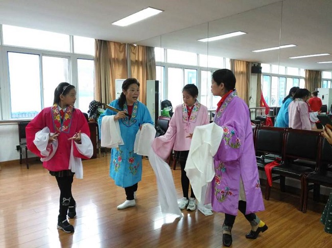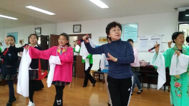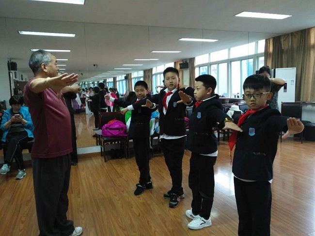 在老年大学的戏曲教室内,京剧队老师和学员们精彩演绎的戏曲选段博得现场学生们连连欢呼。被激发出学习兴趣的孩子们,各个跃跃欲试。女孩子们穿上漂亮的戏装,跟着艺术团京剧队的奶奶们学习旦角的台步和水袖功;男孩子们则跟着爷爷们练习了净角的基本功。